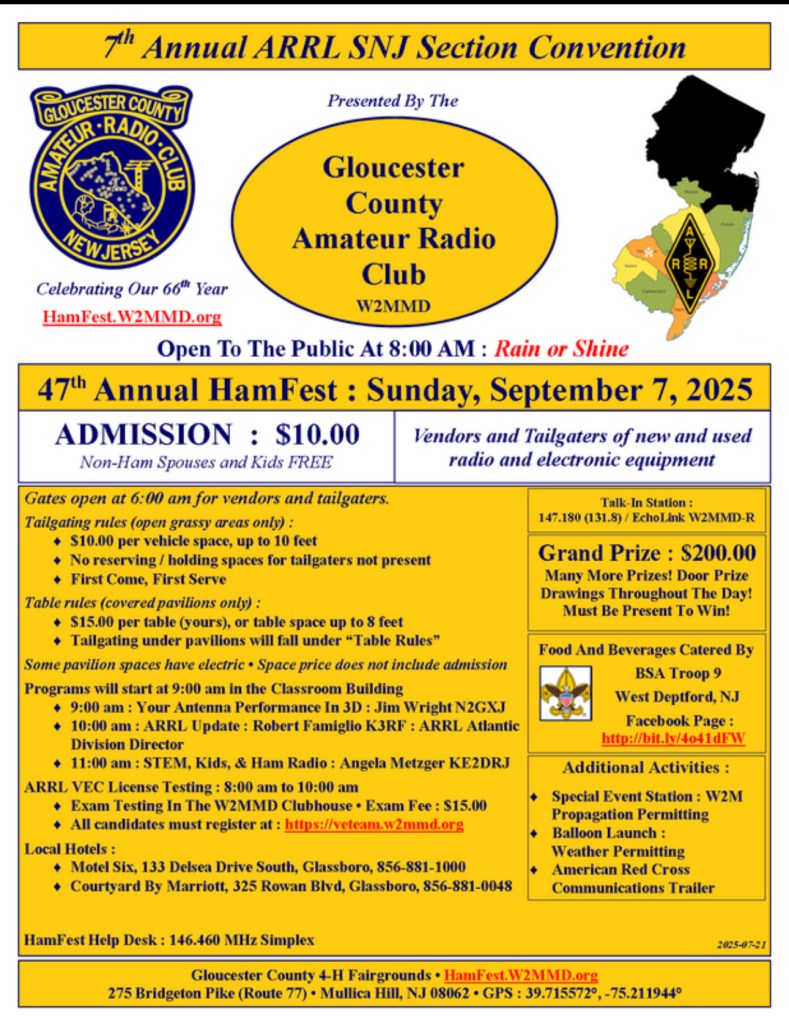 Gloucester County Hamfest Sept 7, 2025 Share this: Click to share on X (Opens in new window) X Click to share on Facebook (Opens in new window) Facebook Like Loading...