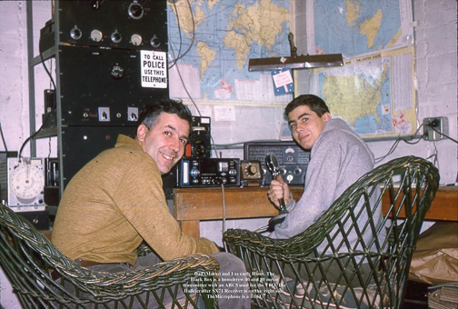 Together, they built a 40/80 meter rack-mounted transmitter with mercury vapor tubes in the power supply, which required waiting for the mercury to vaporize before tuning. He added a surplus ARC5 to provide a VFO and used a fluorescent tube as an output power indicator. An old 1920s telephone mouthpiece served as the microphone. His equipment collection included a Hallicrafter receiver, a Hammerlund HQ170VHF receiver with a working clock, and a UHF converter. For 6m and 2m, he used a Swan 250C and a D104 microphone for the early Gonset Communicator IV. His tower, approved by the Valley Stream town clerk with a hand-drawn sketch, featured stacked 2m and 6m beams and a Tribander.