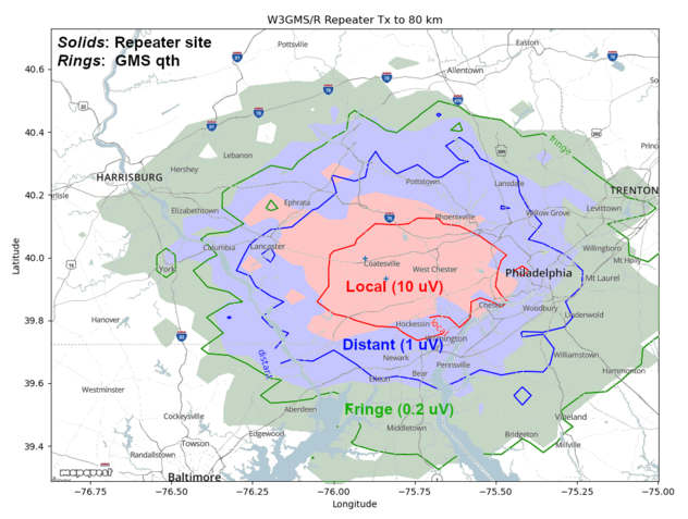 The W3GMS Repeater experiences occasional intermodulation with an unknown source. At its worst, the intermod prevents use of the repeater so Joe plans a new scheme. When intermod rears its ugly head, the repeater will be used in receive mode while transmission (repeating) takes places from the antenna in Joe’s backyard. The question that arises is, what is the difference between the two? The answer is shown in the graph where the solid splotches of color show power from the repeater site. The overlaid rings show receive power from Joe’s back yard antenna.