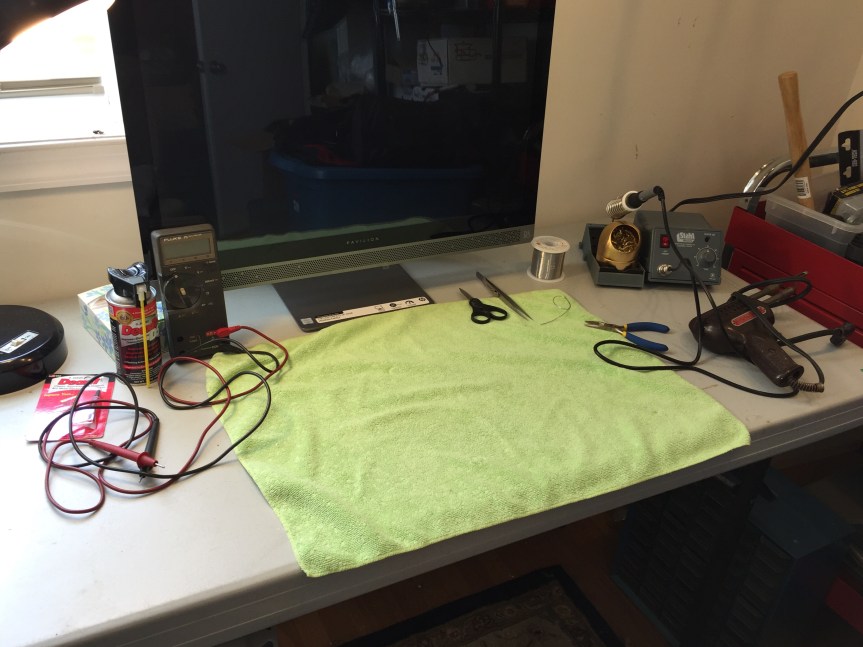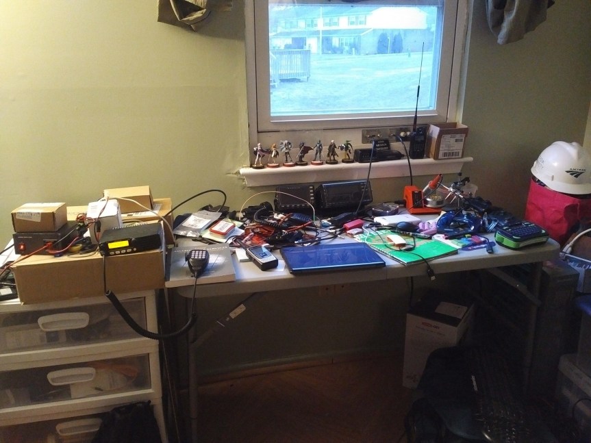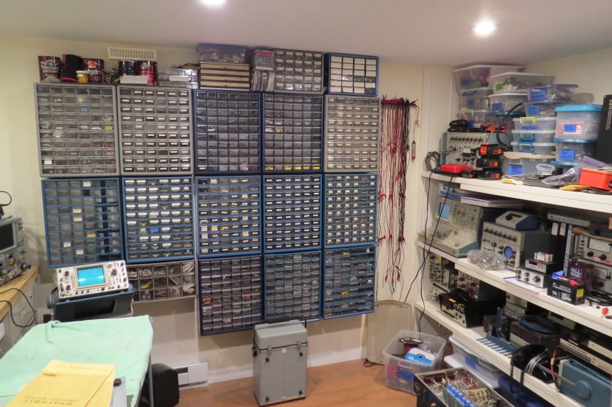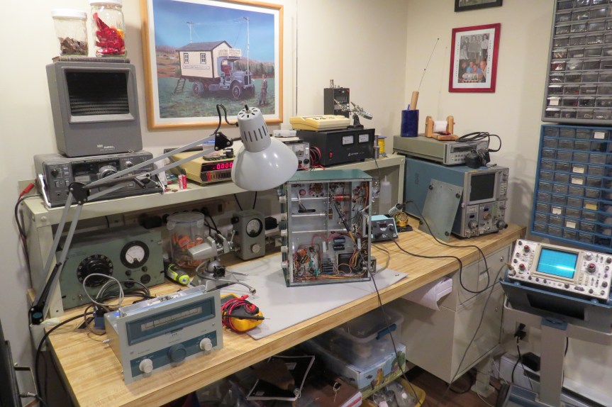The repair, operational restoration and cosmetic restoration of vintage equipment is one of the many aspects of ham radio. Some may have a very basic work area with just a solder iron, while others may have more specialized test equipment. Here is some of the workbenches of 985.